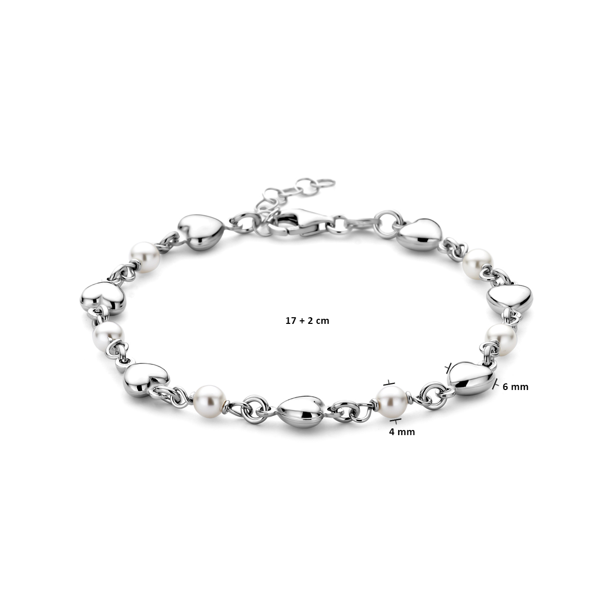 Gerhodineerd 925 zilveren armband uitgevoerd met hartjes en swarovski parels. De armband heeft een draaglengte van 17cm met 2cm extensie. Uitgevoerd met karabijnsluiting.