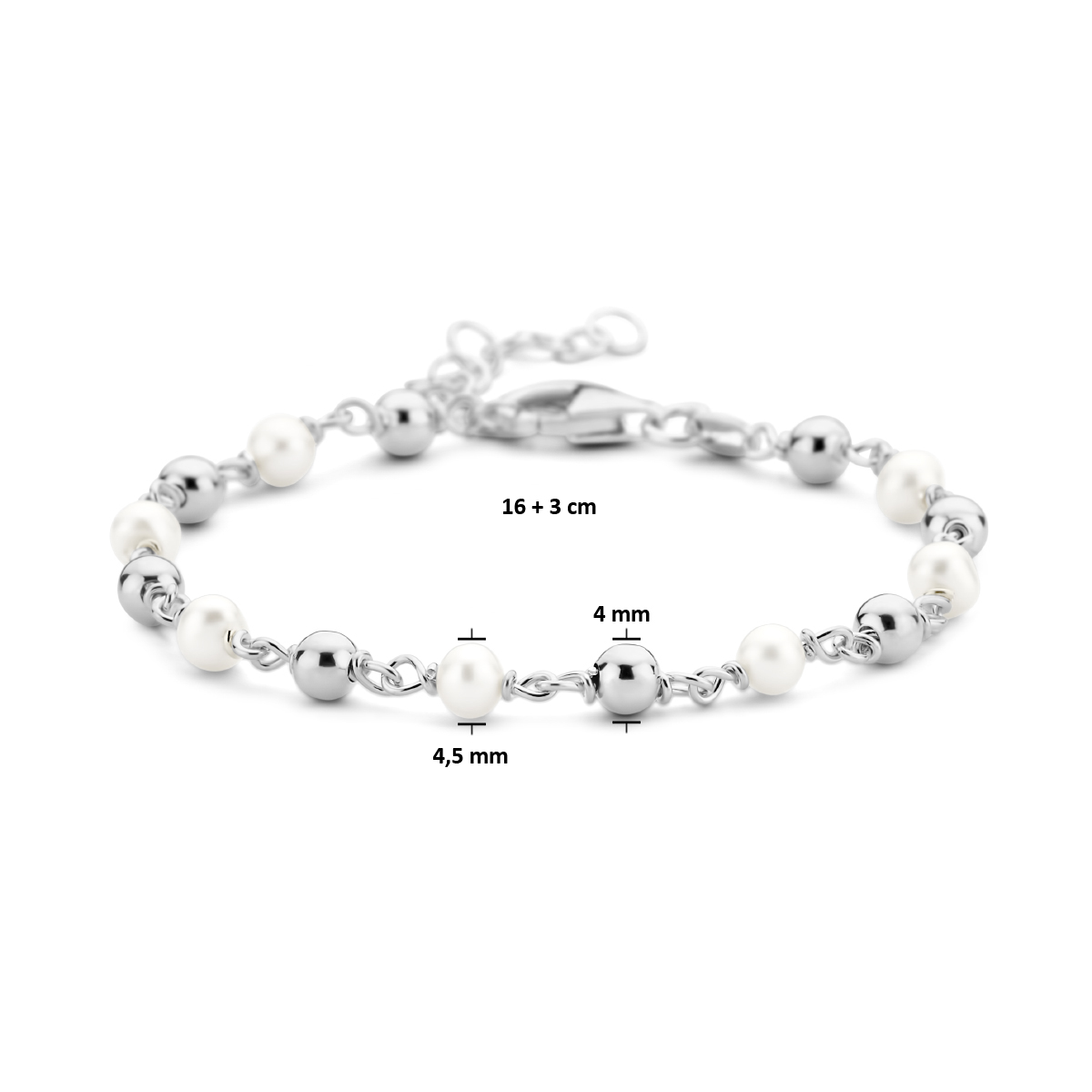 Gerhodineerd 925 zilveren armband met zoetwaterparels van 4.5mm en bolletjes van 4mm. De armband heeft een draaglengte van 16cm en een extensie van 3cm. Uitgevoerd met een karabijn sluiting.