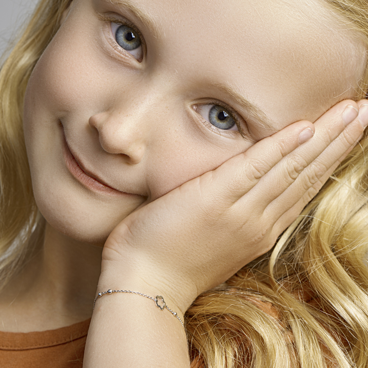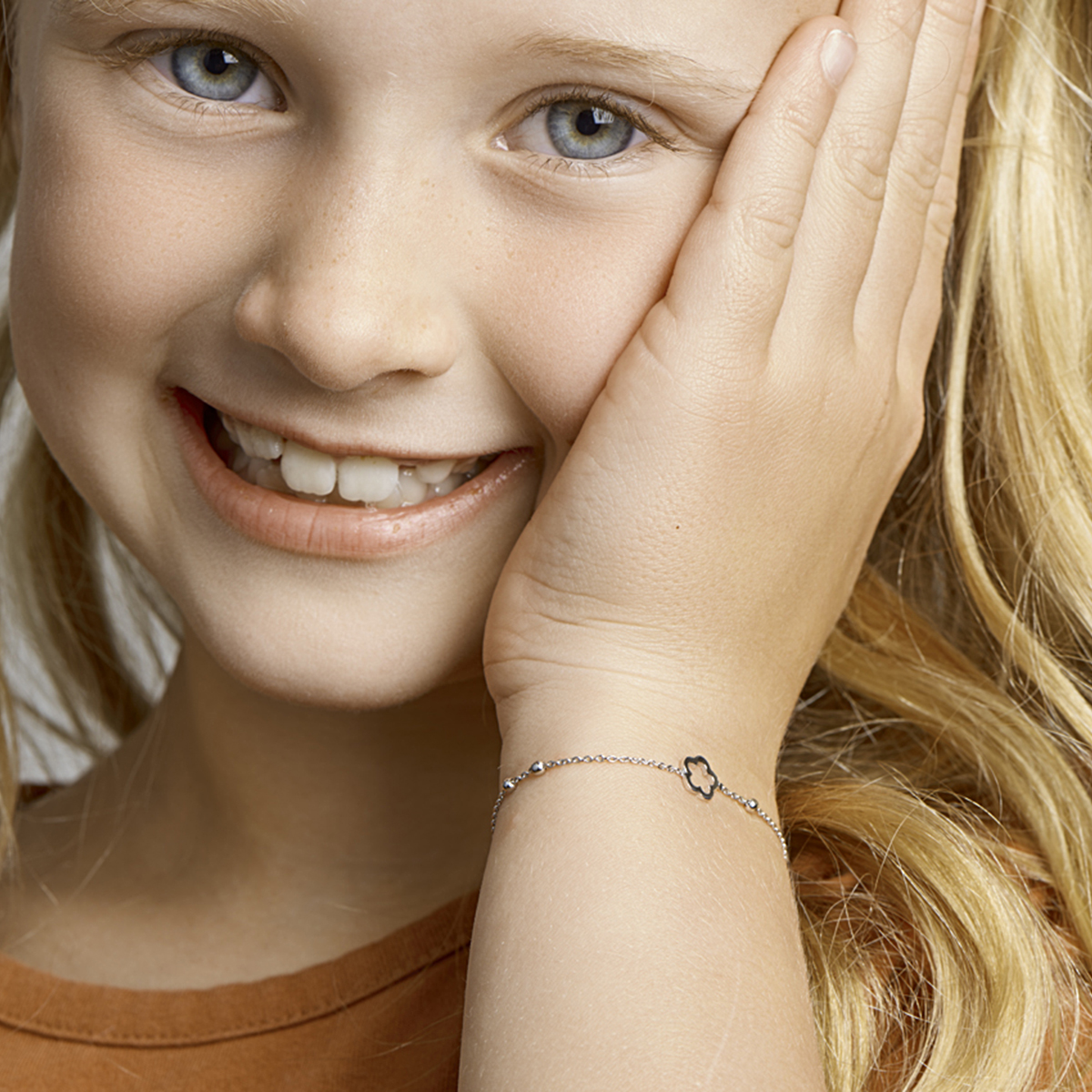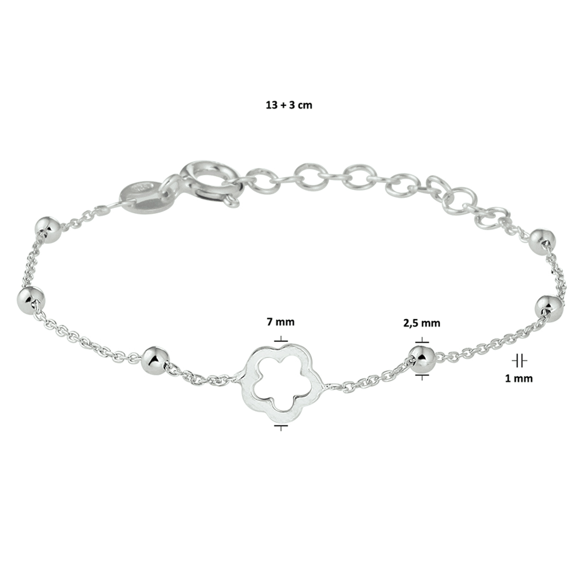 Schattig fijn gerhodineerd zilveren armband met in het midden een open bloem met een afmeting van 7mm en poli afgewerkte bolletjes van 2.5mm. De armband heeft een draaglengte van 13cm en een extensie van 3cm.