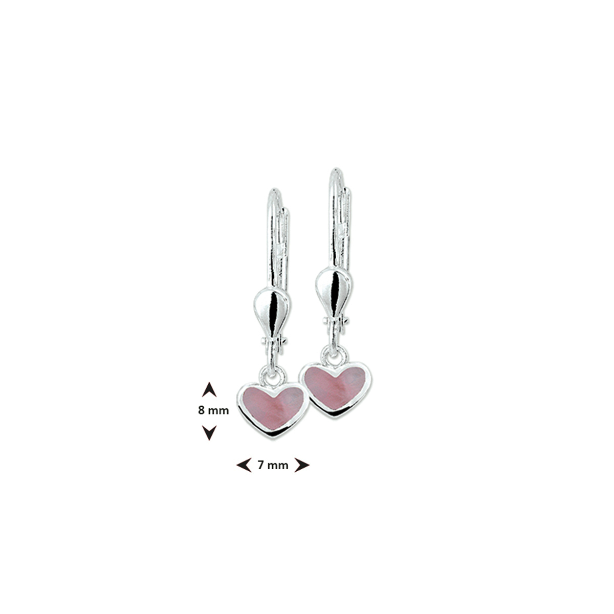 Zilveren oorhangers met een hartje van roze parelmoer. De oorhangers zijn onderdeel van een set.