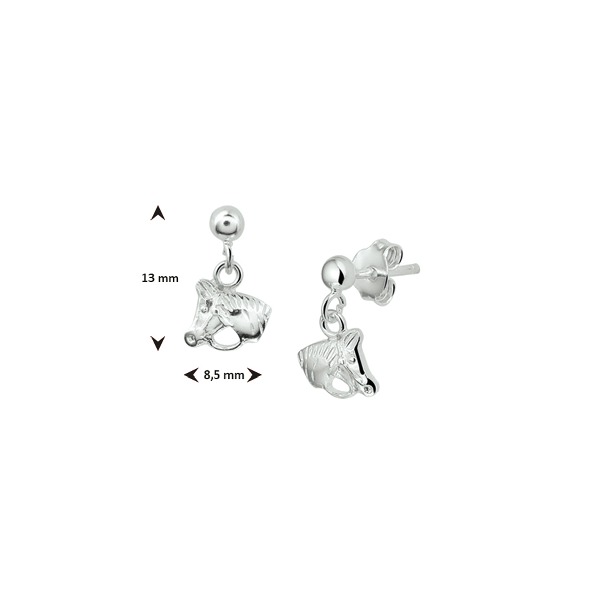 925 zilveren oorhangers uitgevoerd met een paardenhoofd. De oorhangers hebben een totale hoogte van 1.3cm. De hanger heeft een afmeting van 8x8.5mm.
