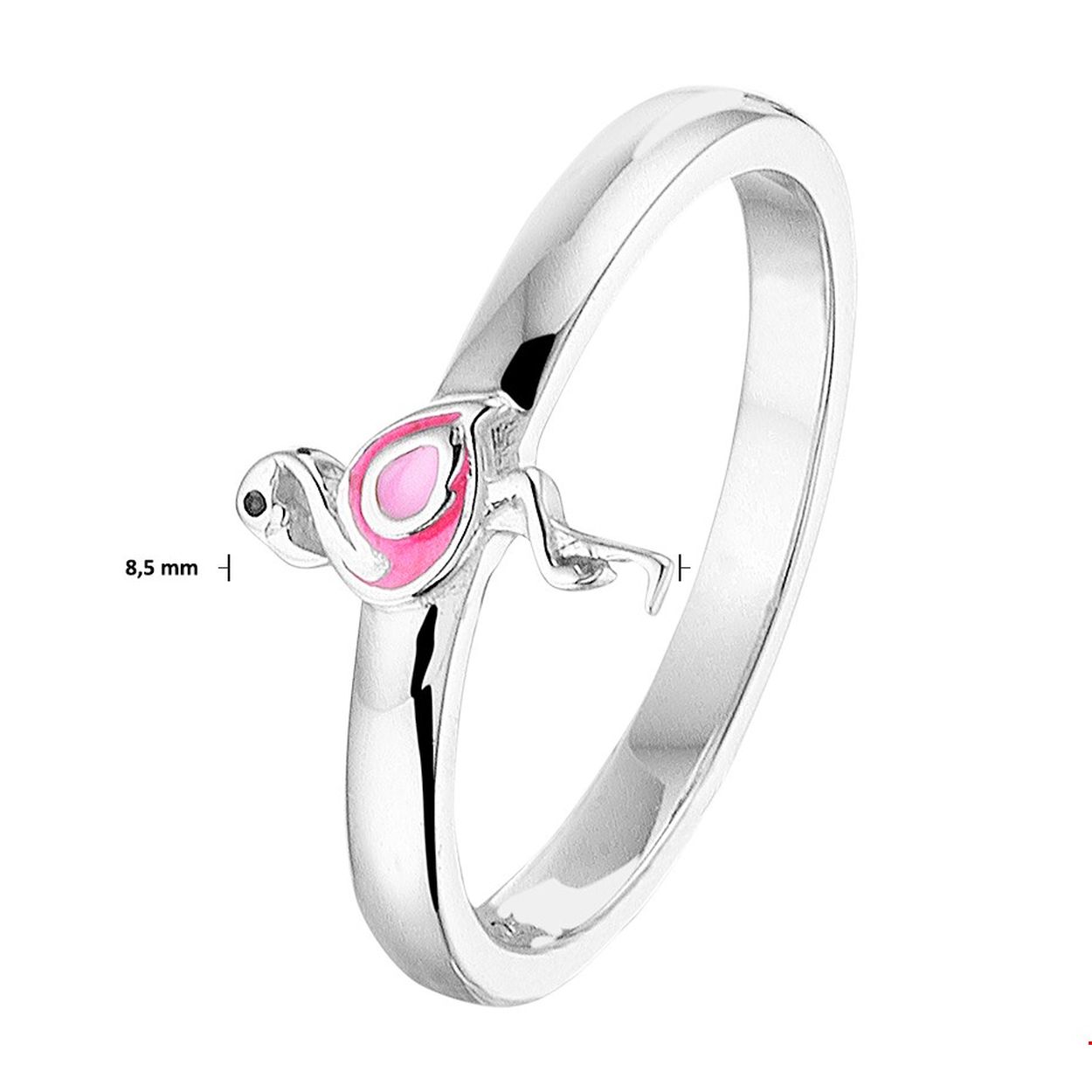 Beschrijving: Deze schattige gerhodineerd zilveren met roze emaille flamingo ring heeft een poli afwerking. De ring is te combineren met bijpassende sieraden zodat er een leuke set van te maken is. Tip: Leuk om kado te geven aan kleine dametjes die willen stralen met schattige sieraden. Info: Gerhodineerd zilver is door de rhodiumlaag beter bestand tegen verkleuren en krassen.